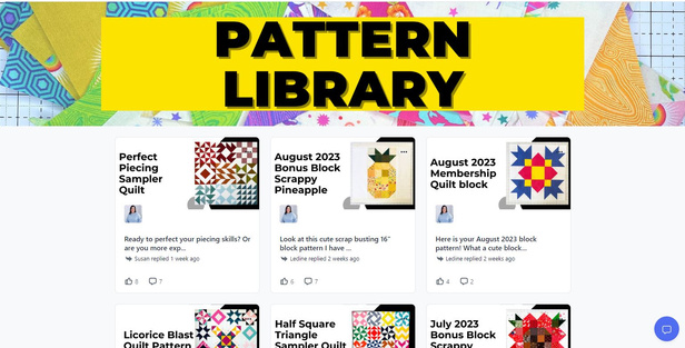 Amazing private community discussion boards, away from social media - it's a safe space for interaction, no judgement, everyone with a common goal! Get advice, post your latest makes or ask questions! Like an amazing quilting guild from the comfort of home! Monthly live calls, mini-workshops, sit & sew time, show & tell sessions and lots of quilty talk!